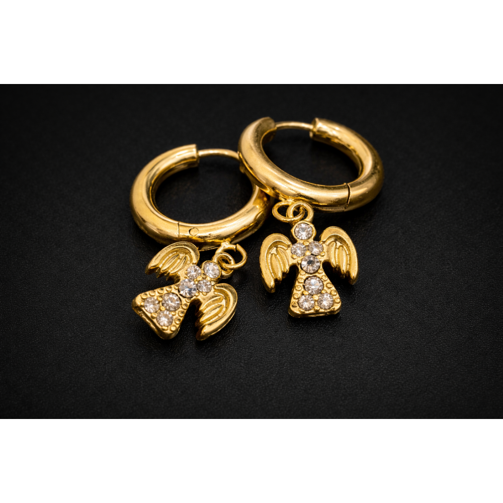 Cerceii Angel Charm sunt o bijuterie delicată și plină de simbolism, creată pentru a adăuga lumină și eleganță fiecărei apariții. Realizați din oțel inoxidabil placat cu aur de 18K, acești cercei au închidere tip cerc (tortiță), de la care atârnă un charm în formă de îngeraș, fin decorat cu zirconii mici și strălucitoare. Designul lor este subtil, feminin și extrem de rafinat, evocând protecție, puritate și grație. Perfecți pentru purtare zilnică sau ca un cadou cu semnificație specială.