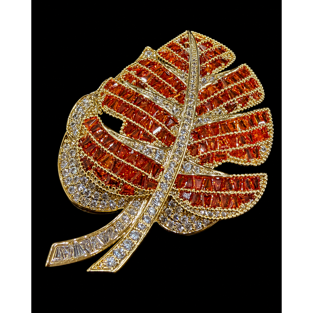 Broșa Amber Leaf este o piesă elegantă și spectaculoasă, realizată sub forma a două frunze stilizate suprapuse. Frunza principală are fond auriu, cu nervura centrală pavată cu zirconiu punctiform auriu, iar suprafața este decorată cu zirconiu cu tăietură baguette în nuanță cărămizie, pentru un efect cald, prețios și foarte rafinat.