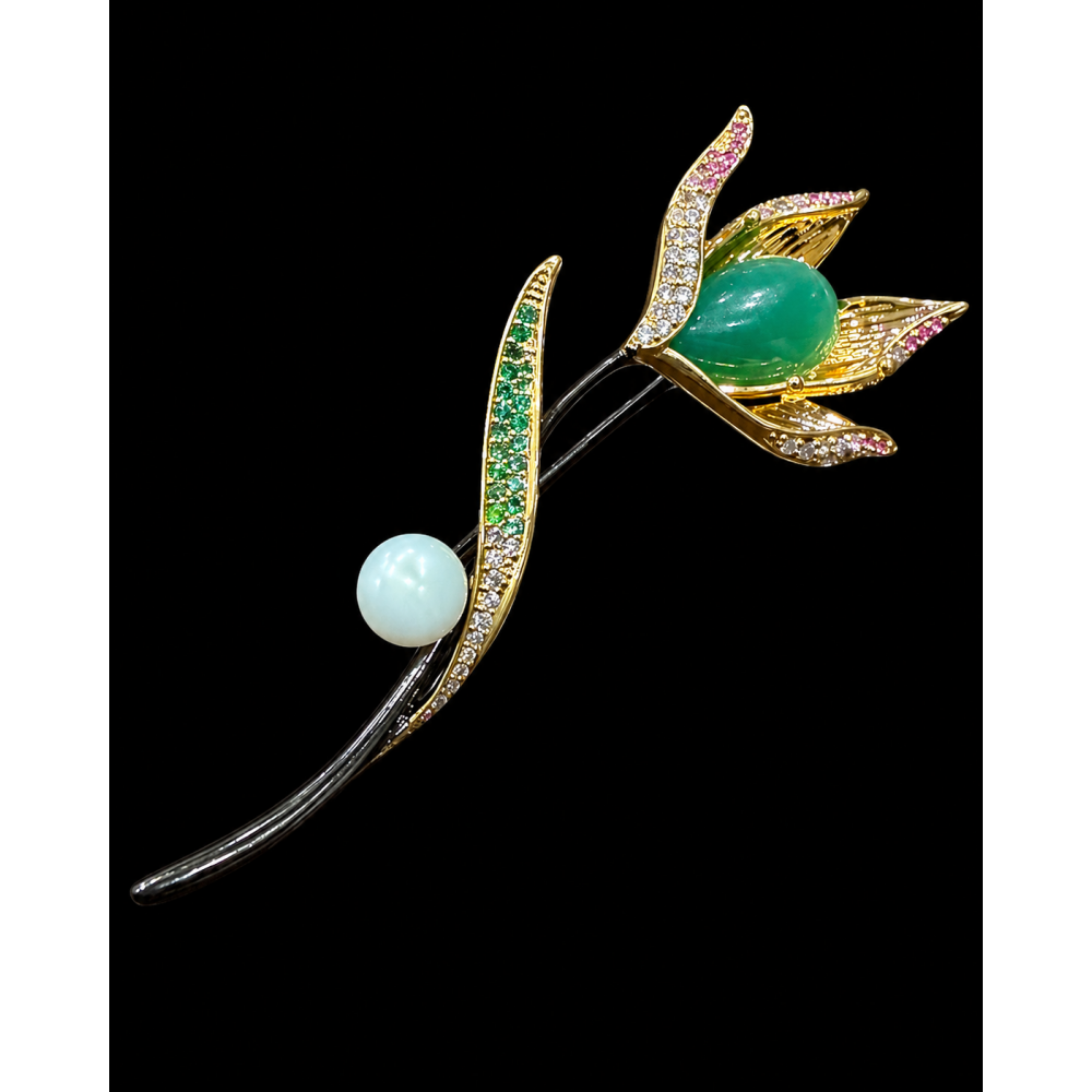 Broșa Bloom Grace este o bijuterie florală elegantă și spectaculoasă, realizată sub forma unei flori rafinate, cu detalii bogate și un design plin de feminitate. Piesa este construită pe o bază aurie, cu tulpină neagră, din care se desprinde o frunză decorată cu zirconiu punctiform verde, accentuată la bază de reflexe aurii. La baza frunzei se află o perlă albă din nacru, care adaugă finețe și echilibru compoziției.