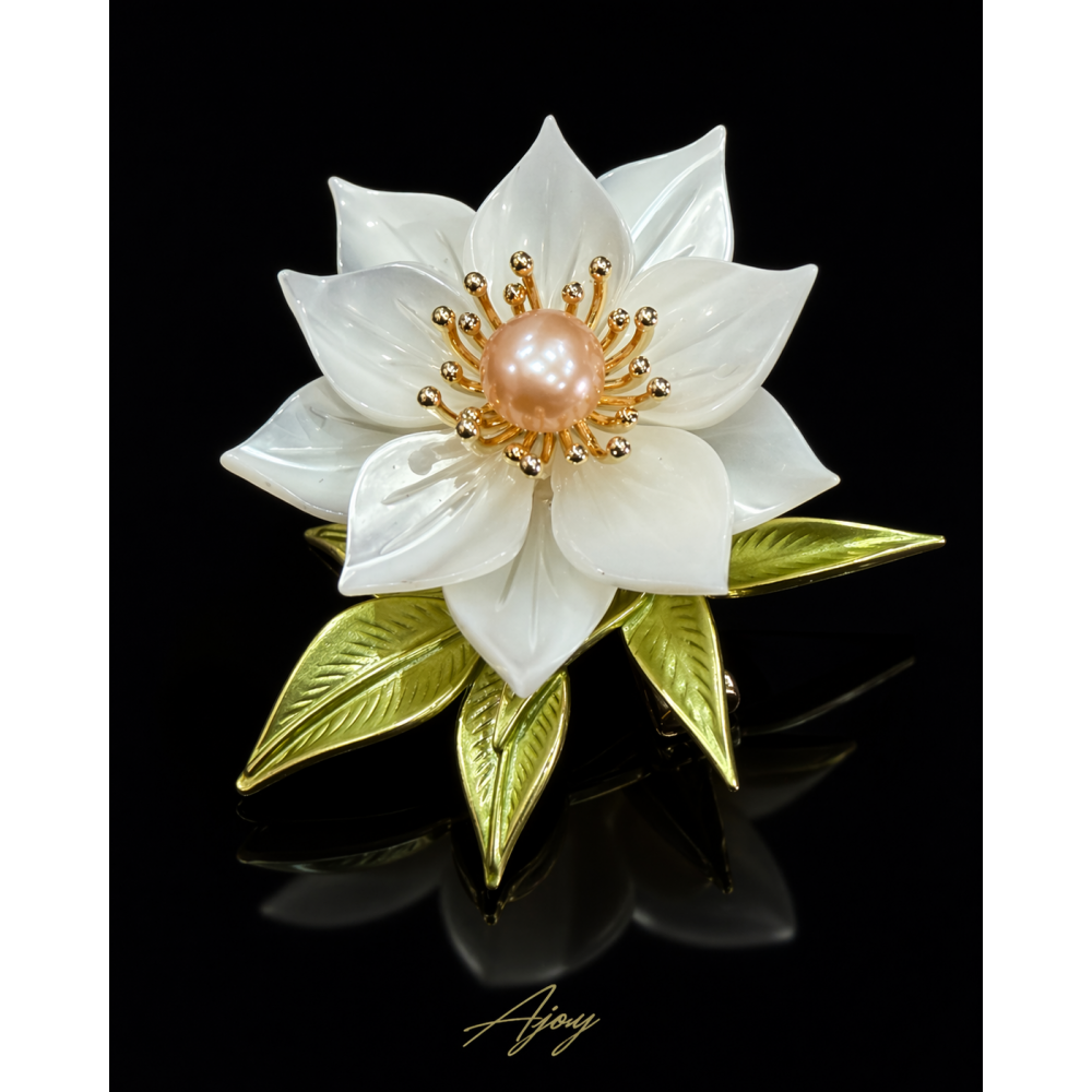 Floarea este realizată din scoică sidefată, ceea ce îi oferă o strălucire fină, perlată și sofisticată. În centrul său se află o perlă roz din pulbere de scoică, care adaugă un accent delicat și romantic întregii compoziții. Sub floare se desfășoară frunze în nuanțe de verde pal sidefat, completând armonios designul și sugerând impresia că nufărul plutește grațios deasupra apei.