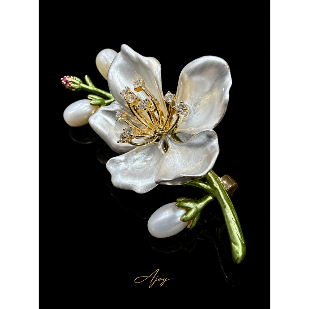 Broșa Cherry Petal Dream este o bijuterie florală delicată și elegantă, inspirată de frumusețea fragilă a ramurilor de cireș înflorit. Piesa este realizată sub forma unei crenguțe decorative, pe care se regăsește o floare de cireș rafinată, completată de boboci cu aspect prețios și feminin.