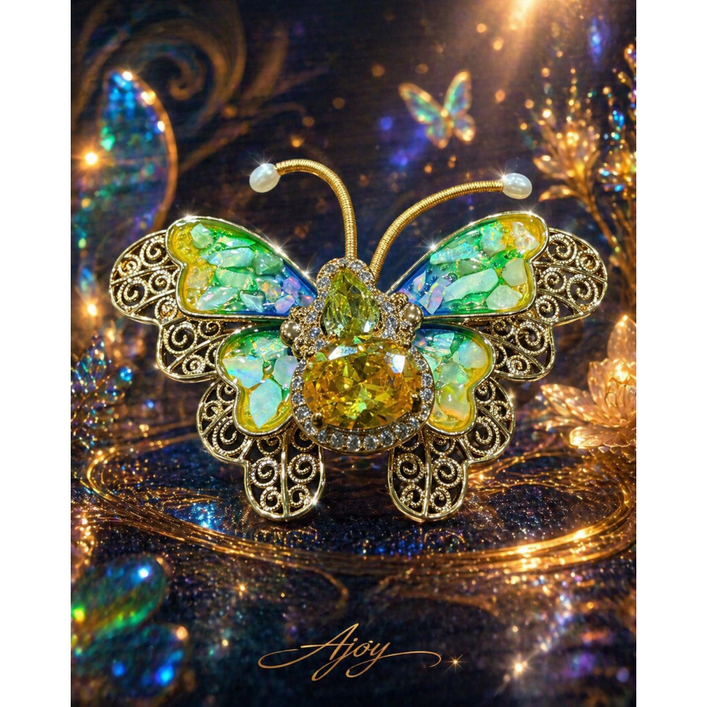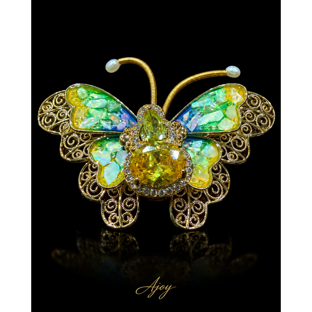 Fluturele este construit din două rânduri de aripi suprapuse. Aripile inferioare au aspect de dantelărie filigranată, bogat decupată, cu modele elaborate și elegante. Al doilea rând de aripi este realizat din sidef în degrade de galben spre verde, oferind un efect luminos, proaspăt și foarte sofisticat. Corpul fluturelui este evidențiat de cristale mari galbene, înconjurate de zirconii mici albe, care completează frumos jocul de lumină și culoare. Întreaga bază este aurie, accentuând eleganța și căldura piesei.