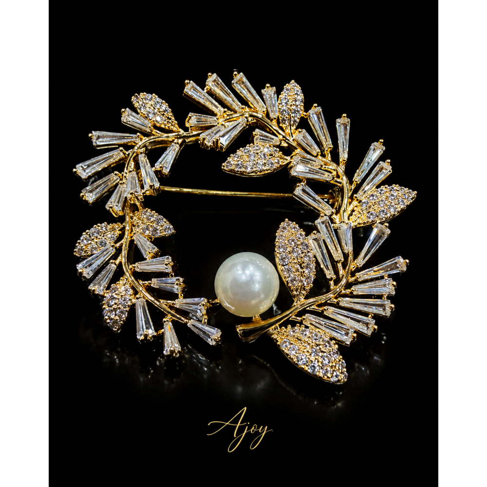 Frunzulițele aurii sunt pavate cu zirconiu punctiform, adăugând textură, finețe și un plus de strălucire compoziției. La închiderea cercului se află o perlă, care completează armonios designul și oferă broșei un accent prețios, feminin și nobil. Întreaga piesă are un aspect delicat, dar remarcabil, fiind potrivită pentru femeile care iubesc accesoriile elegante și cu personalitate.