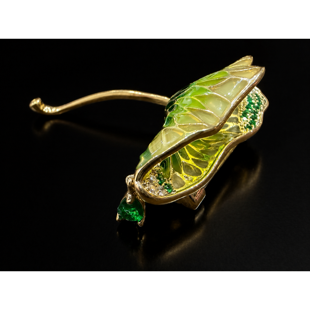 Broșa Elegant Lotus este o bijuterie decorativă spectaculoasă, realizată sub forma unei frunze de lotus stilizate, ușor îndoite, cu un design elegant și expresiv. Piesa are aspect de vitraliu, fiind realizată din sticlă vopsită în degradeuri fine de la galben la verde, pentru un efect luminos, artistic și deosebit de sofisticat.