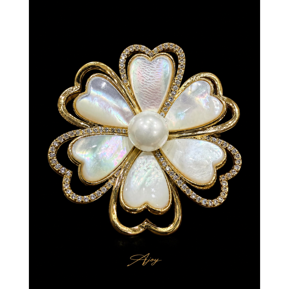 Floarea este alcătuită din două rânduri de petale. Petalele centrale sunt realizate din sidef alb din nacru și încadrează un centru format dintr-o perlă tot din nacru, oferind broșei un aspect luminos, delicat și prețios. La exterior, un al doilea rând de petale decupate este intercalat elegant: unele petale sunt pavate cu zirconiu, iar altele sunt simple, ceea ce creează un joc sofisticat de texturi și lumini.