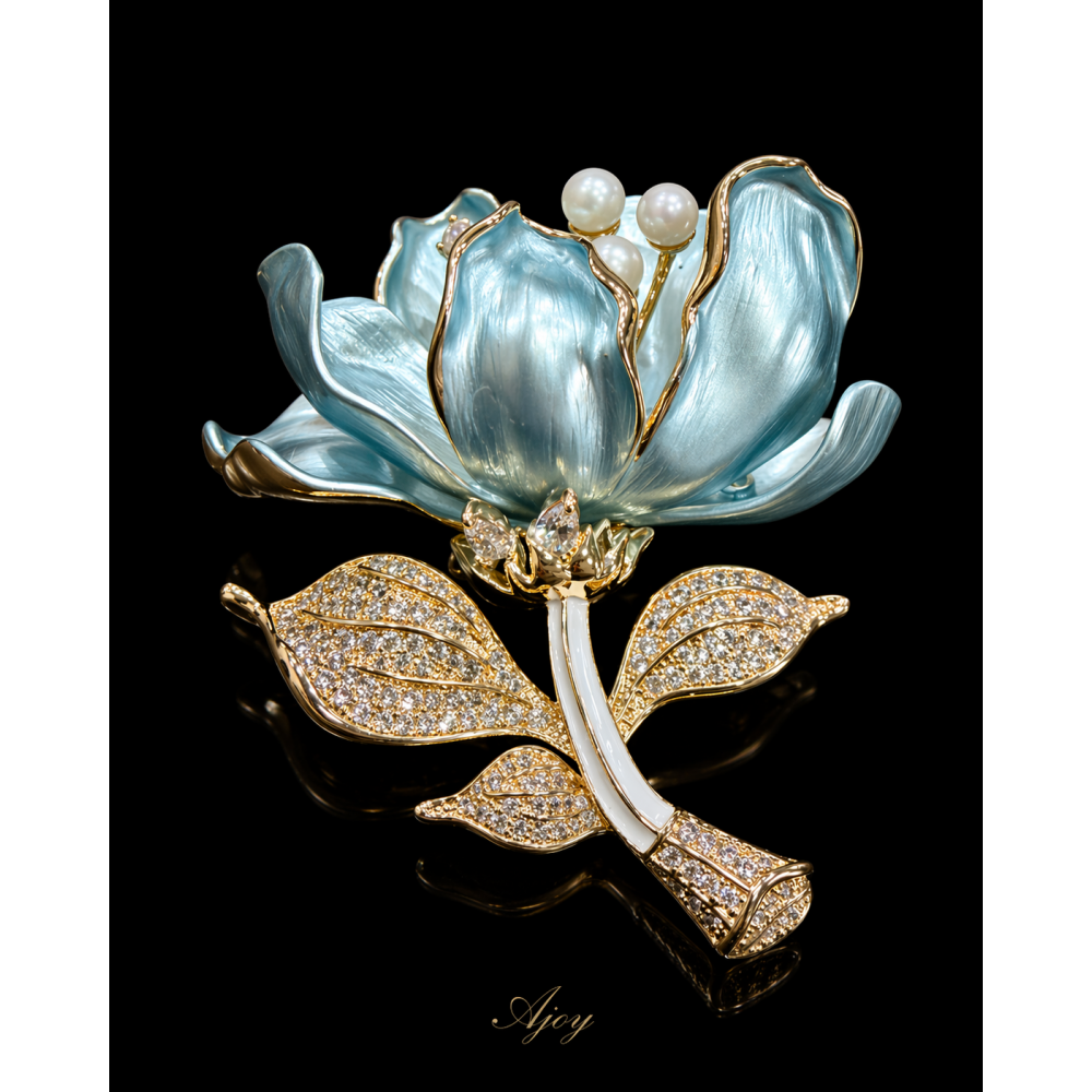Floarea are un design amplu, cu petale bleu deschis, finisate cu margini creponate și aurite, care îi oferă un aspect rafinat și expresiv. Frunzele aurii și decorul cu zirconii mici creează o textură prețioasă, catifelată vizual, conferind broșei o strălucire fină și elegantă. Tulpina este emailată cu alb, adăugând un contrast delicat și sofisticat întregii compoziții. În centrul florii se află patru perlute din pulbere de scoică / nacru, completate de un zirconiu mai mare, așezat asemenea unui strop de rouă pierdut printre sepale, detaliu care oferă piesei un farmec poetic și luxos.