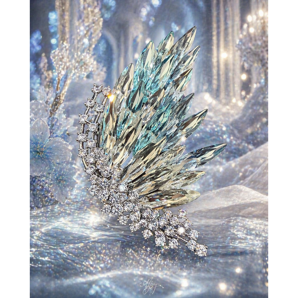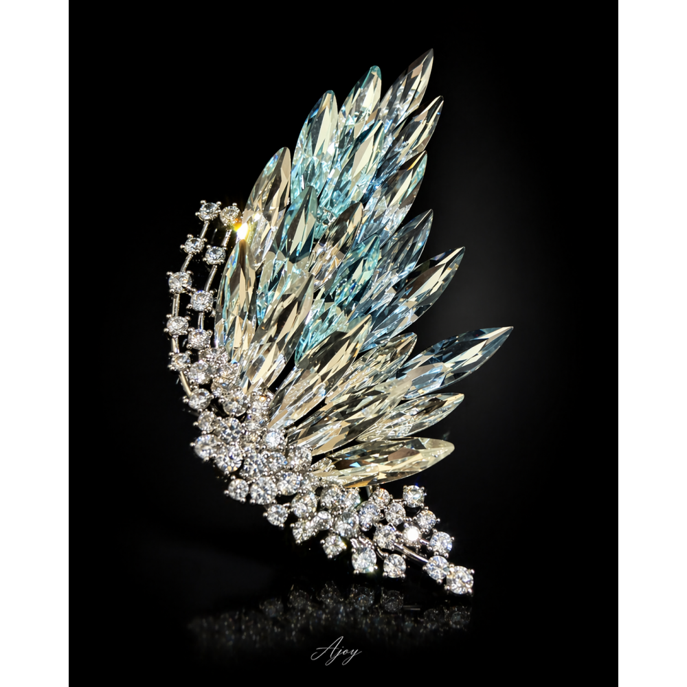 Este decorată integral cu zirconii premium, așezate într-un degrade rafinat de la albastru închis la bleu luminos și alb cristalin. Aripile au un design spectaculos, cu zirconii dispuse în forme ascuțite, asemănătoare unor țepi sau colți fini, oferind broșei un aer dramatic, sofisticat și modern. Corpul este evidențiat prin detalii punctiforme, care completează delicat compoziția și adaugă profunzime vizuală.
