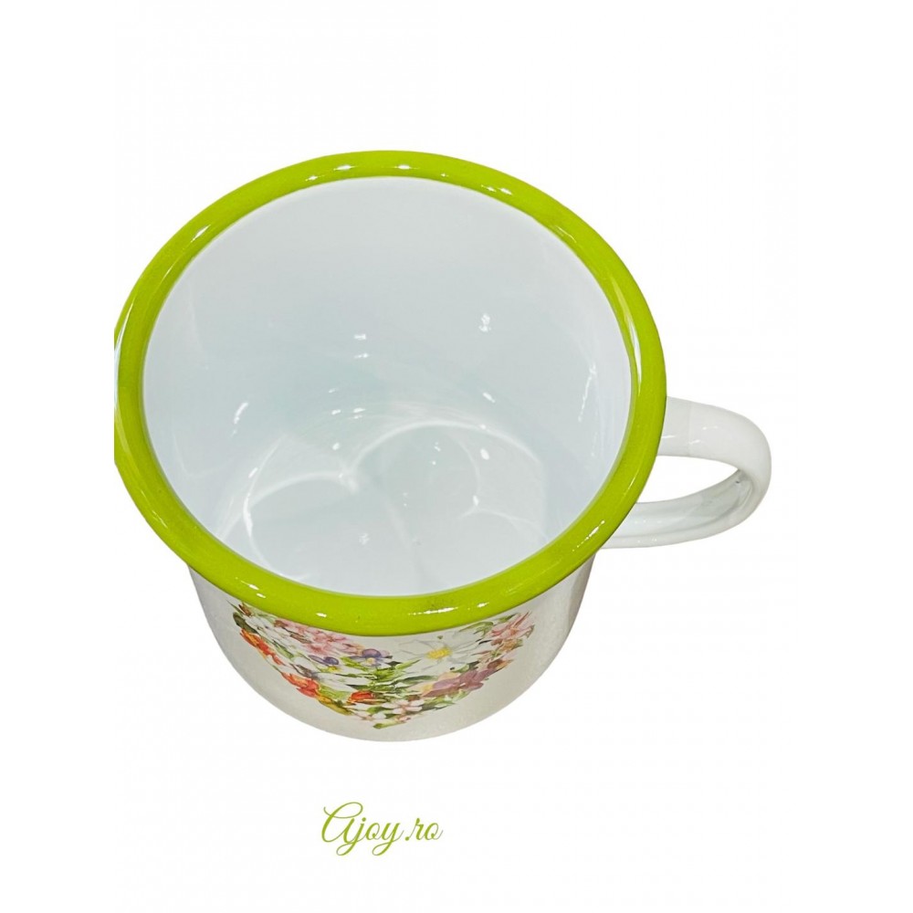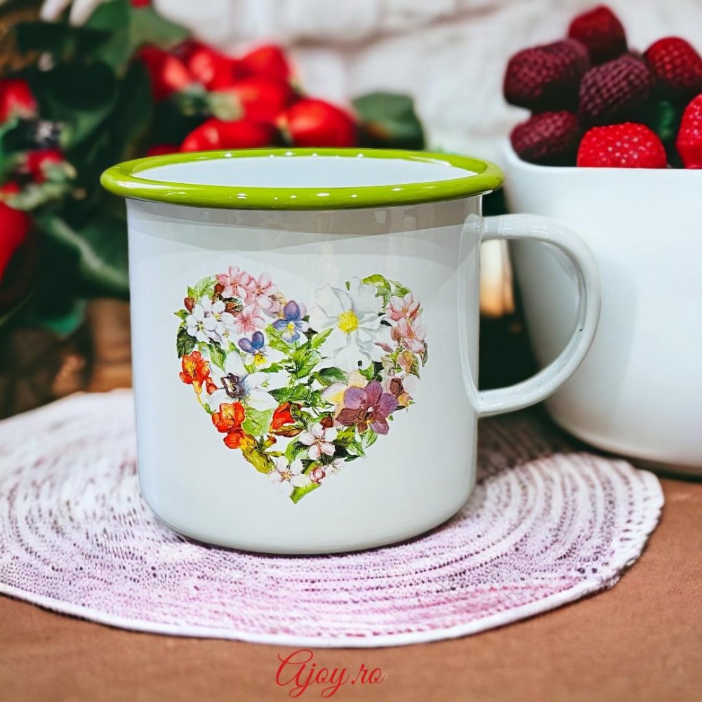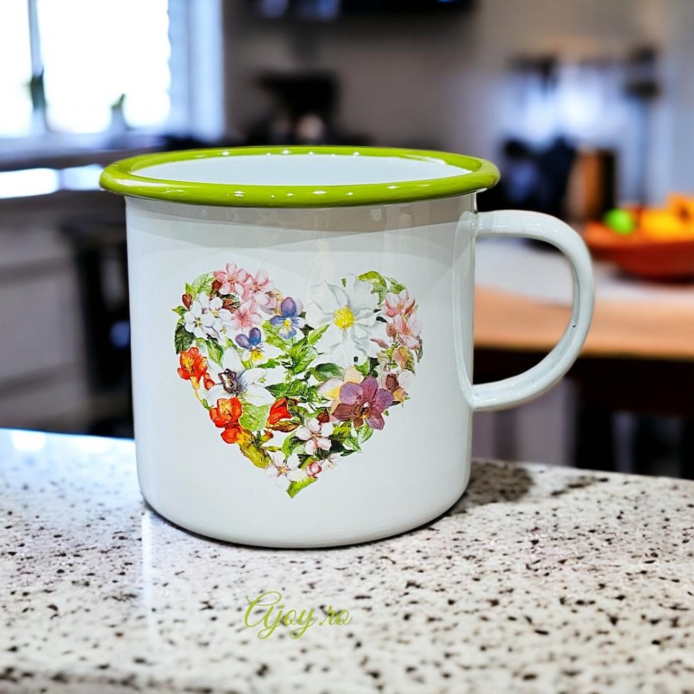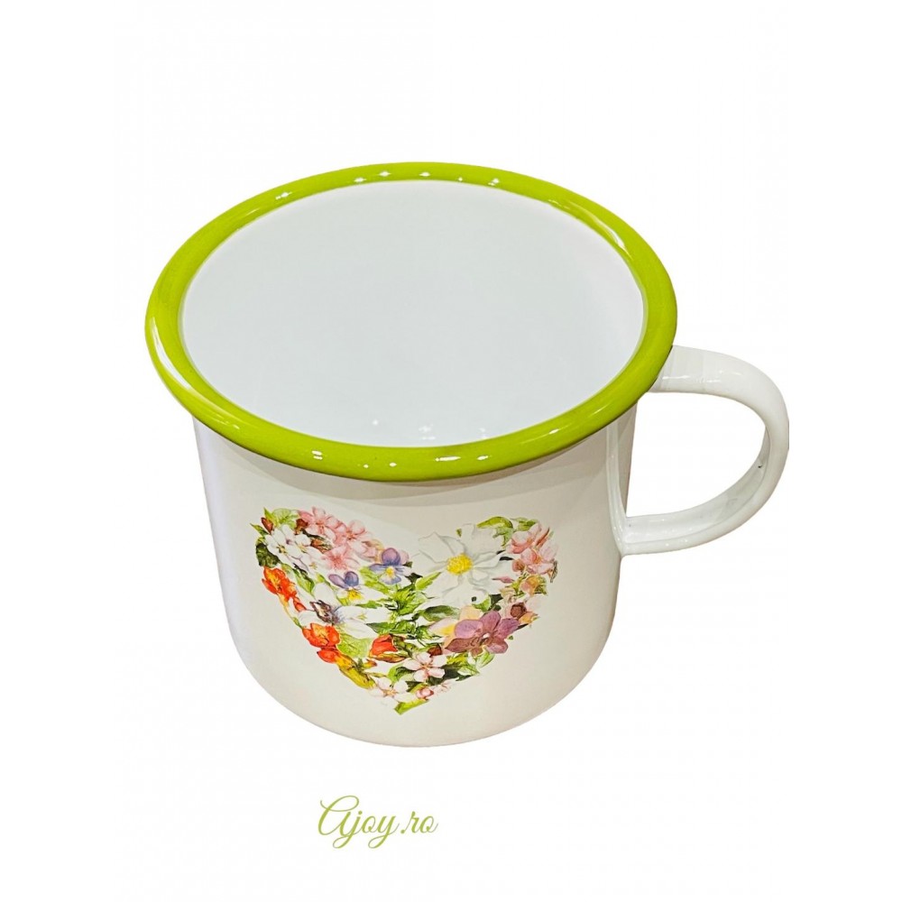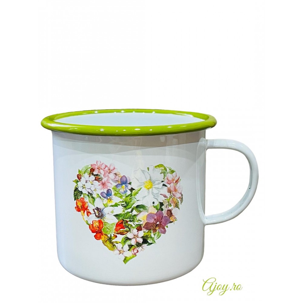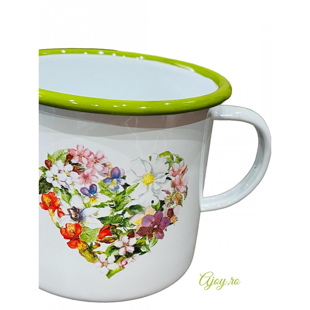 Această cană este perfectă pentru iubitorii de design vintage și rustic. Este fabricată din metal emailat de înaltă calitate, ceea ce o face durabilă și potrivită pentru utilizarea zilnică. Designul său delicat și romantic cu o inima realizata din flori multicolore, o face o alegere excelentă pentru a fi folosită la ceai sau cafea. Este ușoară și perfectă pentru a fi utilizată acasă sau în aer liber, în timpul unei plimbări în natură.
