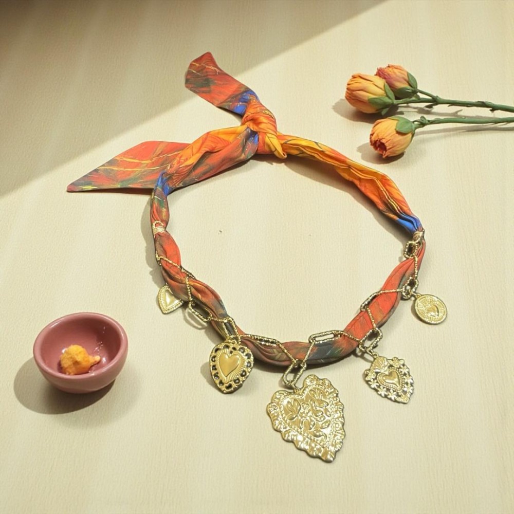 „Echarpe d’Or” este un colier spectaculos, cu design unic, care combină strălucirea lanțului din oțel inoxidabil cu fluiditatea elegantă a unei eșarfe textile. Eșarfa se prinde la spate, completând piesa cu un aer sofisticat și couture, în nuanțe calde de maron-roșcat, împletite subtil cu fire albastre. O bijuterie extravagantă și versatilă, ce transformă orice ținută într-o apariție memorabilă – o creație Ajoy pentru femeile care adoră eleganța cu personalitate.