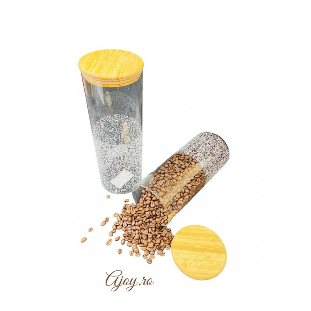 Set format din 2 recipiente foarte utile pentru depozitarea diverselor produse ( cafea, zahar,orez, etc ). Recipientele sunt realizate din sticla transparenta iar in partea de jos au un model scris cu alb si alcatiuit din diverse cuvinte amestecate intre ele. Capacul recipientelor este din lemn si este prevazut cu o garnitura ce asigura o etanseizare perfecta.